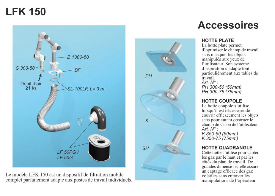 La hotte plate permet d’optimiser le champ de travail sans masquer les objets manipules aux yeux de l’utilisateur. Son système d’aspiration s’adapte tout particulièrement aux tables de travail.
